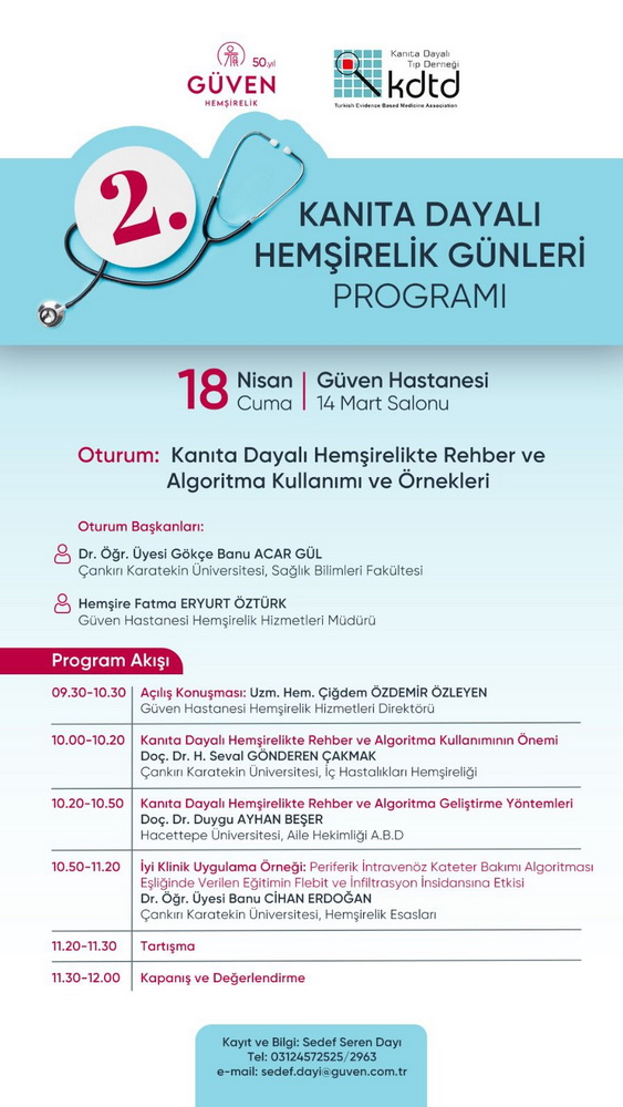 Güven Hastanesi ile Kanıta Dayalı Tıp Derneği iş birliğinde düzenlenen “2. Kanıta Dayalı Hemşirelik Günleri” başarıyla gerçekleştirildi. 18 Nisan Cuma günü Güven Hastanesi 14 Mart Salonu’nda düzenlenen etkinlik, hemşirelik alanında kanıta dayalı uygulamaların önemine dikkat çekti.